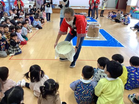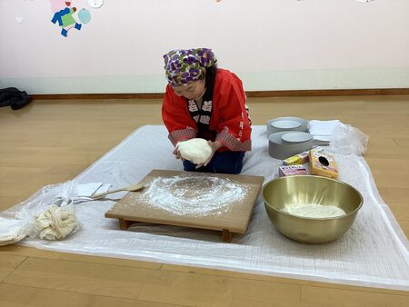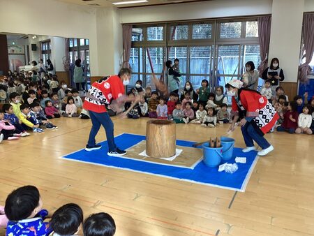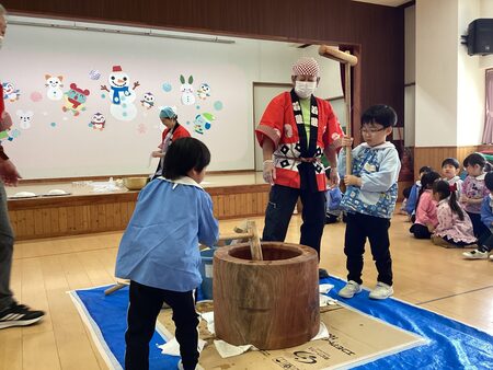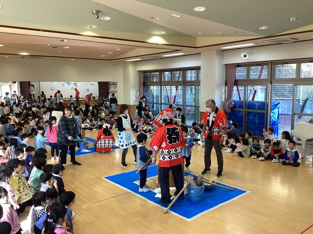 本日、もちつきがありました。もちつきが始まるのを子どもたちは楽しみにしている様子でした。もち米を近くで見たり、目つぶしの様子をみんなで掛け声やお歌を歌って応援しました。年中さんや年長さんも掛け声に合わせてもち米をぺったん!みるみるもち米は伸びていき、おもちに変わりました!もち米は鏡餅になり、玄関に飾るのでぜひご覧下さい。